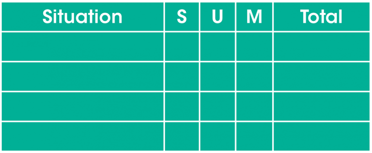- Plot out a small table with five headings: Situation, S, U, M, and Total. Something a little like this…